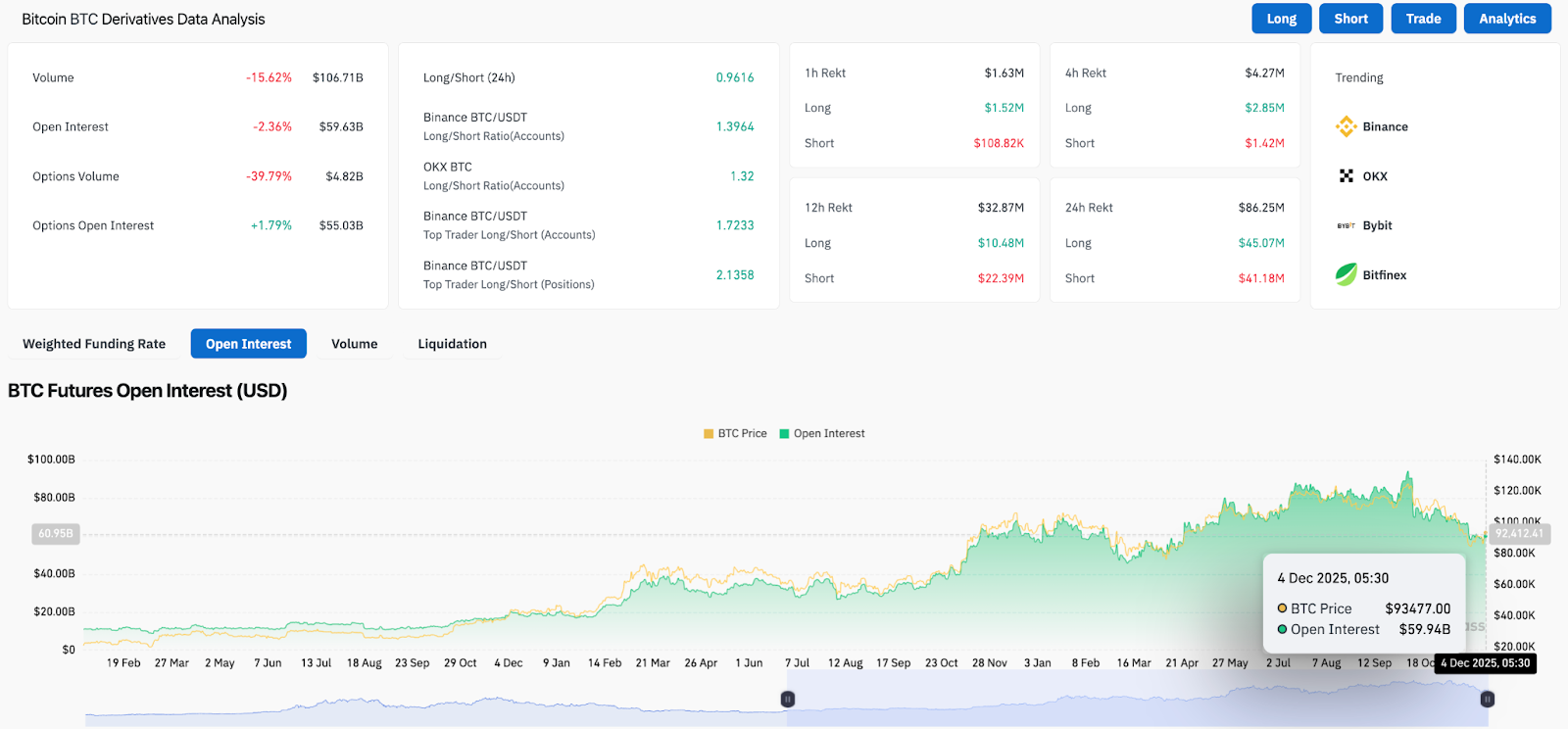 Derivatives positioning also shows a drop in confidence. Open interest fell more than 2 percent to around $59.6 billion, which means traders are closing positions rather than building new ones.