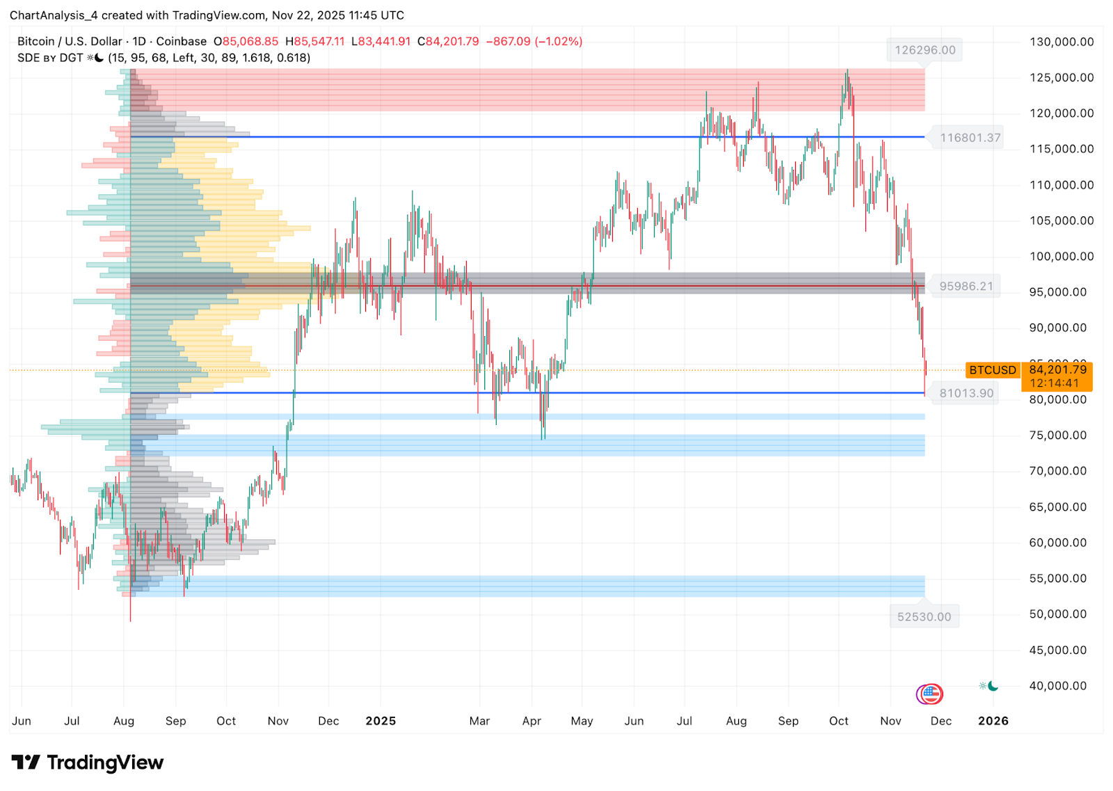Bitcoin trades near $84,200 after slicing below the $95,900 support cluster that held for most of the year. The rejection at $116,800 triggered a sharp rotation out of long positions, and sellers have driven the price directly into a long-term trendline that has defined the market.