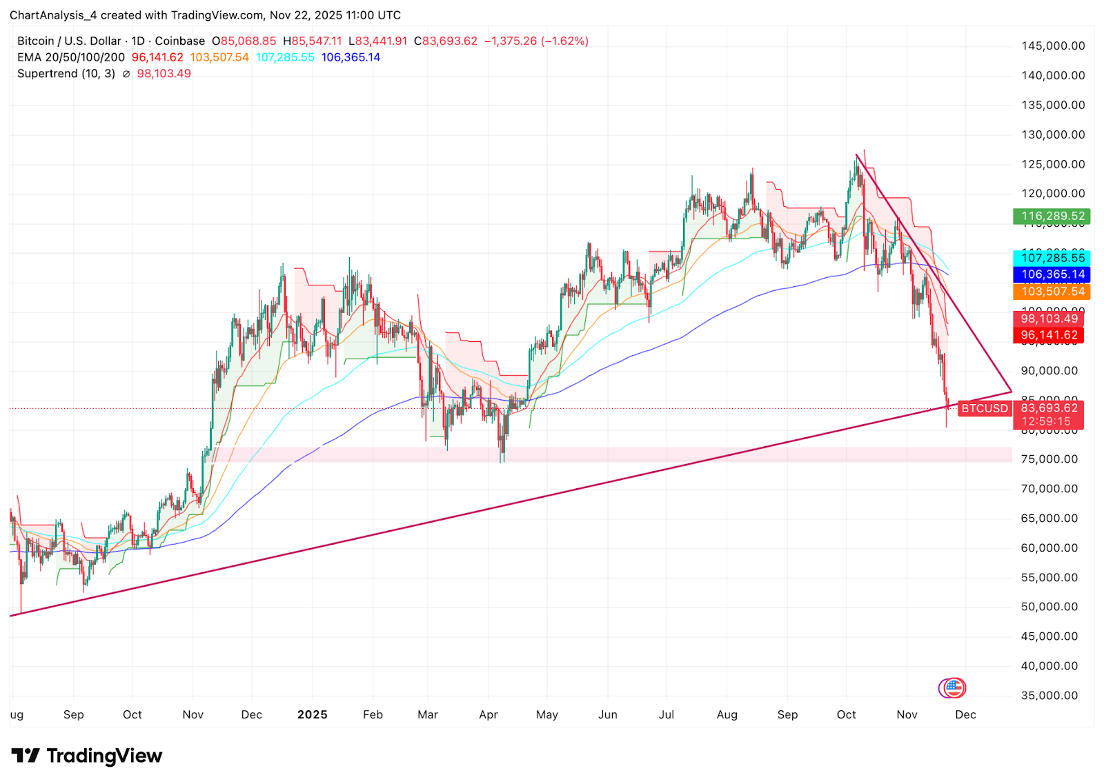 Bitcoin now sits on a long-term trendline, and the next move depends entirely on how buyers react at $83,000 to $81,000.