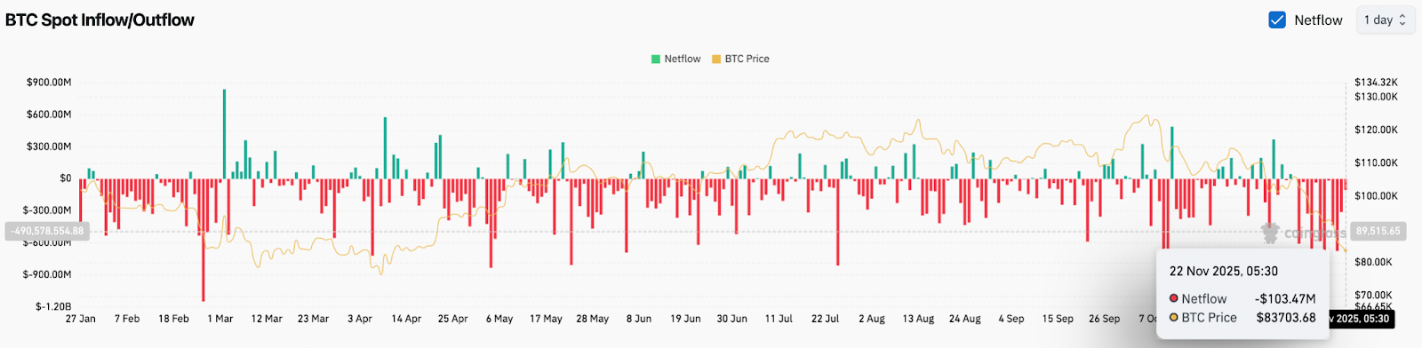 CoinGlass data shows another heavy outflow day, with roughly $103 million exiting exchanges on November 22.