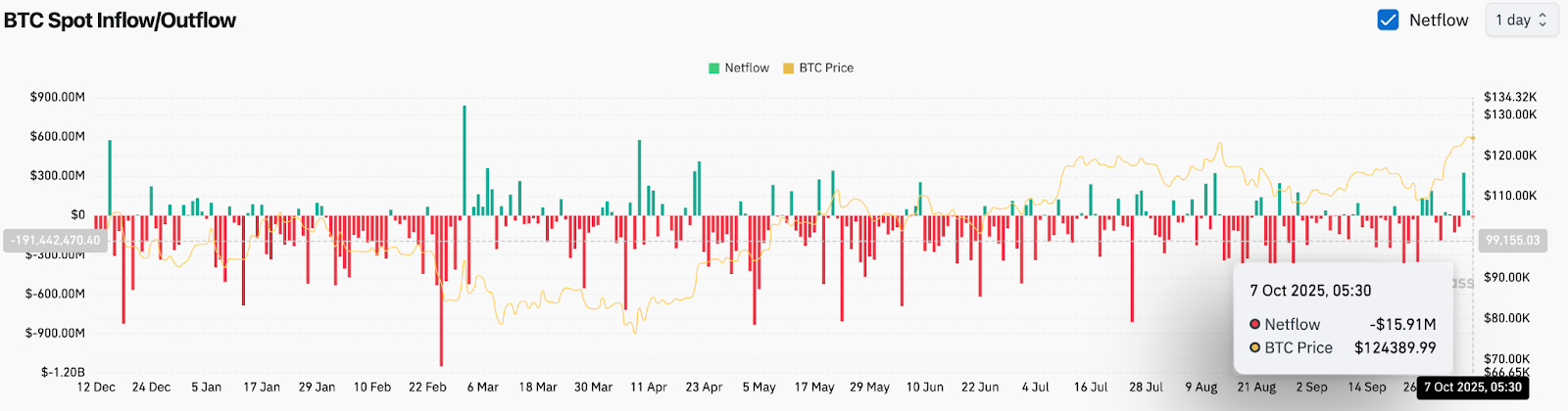 As per Coinglass, spot exchange data shows a net outflow of $15.9 million on October 7, reflecting cautious accumulation rather than aggressive distribution. Over the past two weeks, netflows have alternated between small inflows and outflows, suggesting that traders are taking profits but not exiting positions.