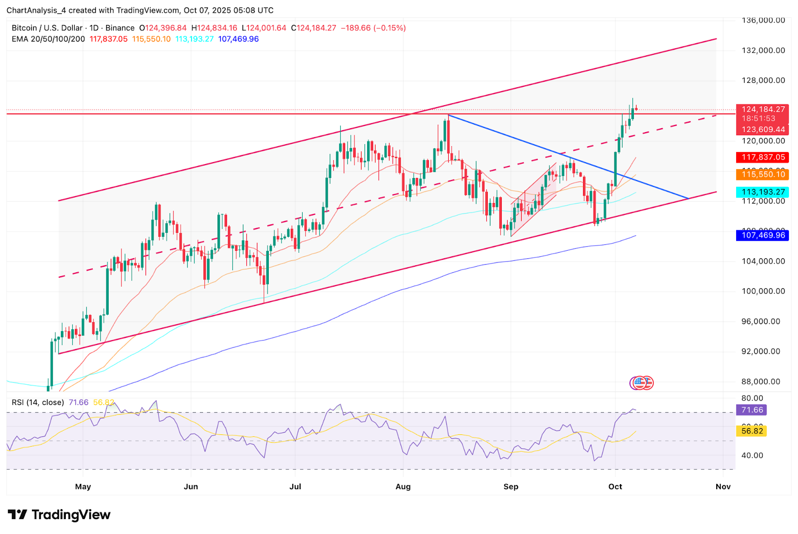 The daily chart shows Bitcoin sustaining a strong advance inside a rising channel, with price now testing the midline near $124,800. The 20-day EMA at $117,800 and the 50-day EMA at $115,500 have formed a solid support cluster, confirming the bullish alignment of trend.
