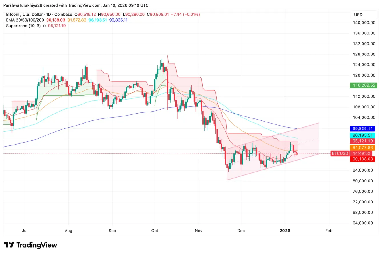 Bitcoin price today sits inside a descending triangle that has compressed volatility for weeks. The pattern formed after the drop from November highs above $120,000, and price is now testing the lower boundary near $90,000.