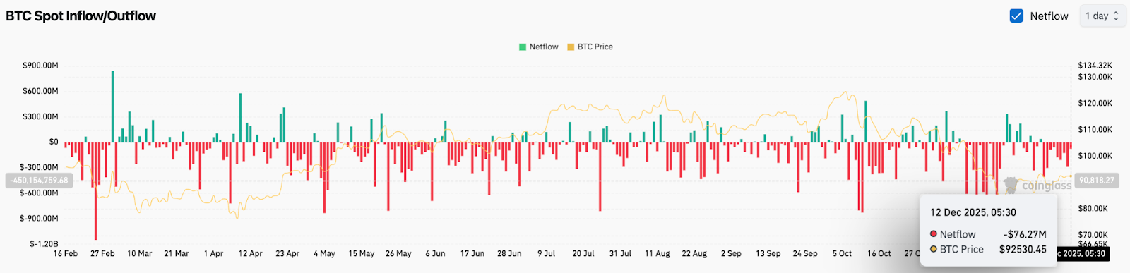 This aligns with spot data. Coinglass shows a $76.27M net outflow on December 12, marking another day where liquidity moved away from holding wallets and into exchanges. Persistent red bars across weekly flow readings highlight caution, and the inflow spikes from earlier in the year have not returned.