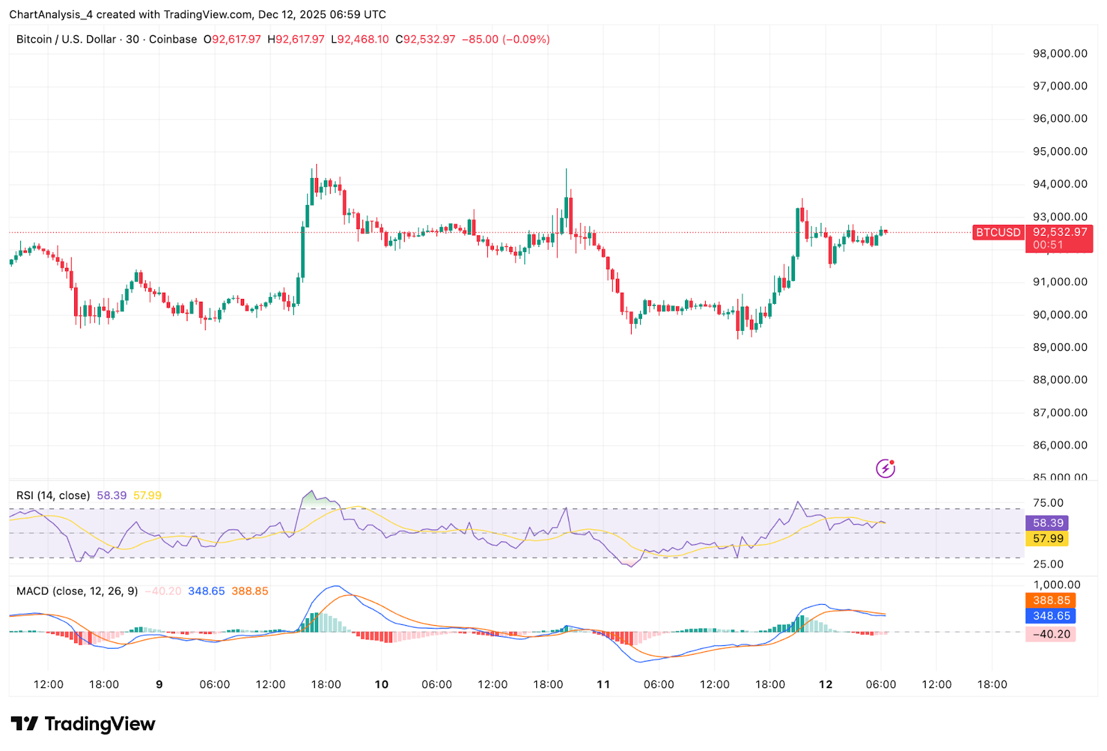 The 30-minute chart shows a mild recovery attempt after the Wednesday pullback. BTC reclaimed $92,500, but price is moving sideways with weak volume behind it. RSI sits near 58, showing mild momentum, while MACD remains above the signal line but is flattening.