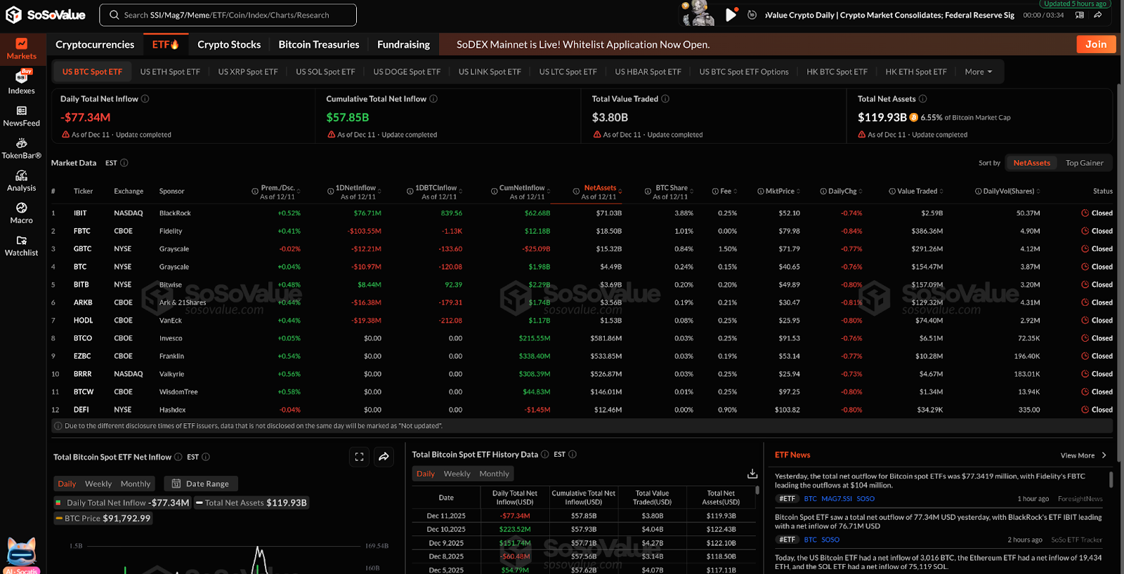 Data from SoSoValue confirms $77.34M in net outflows on December 11 across U.S. Bitcoin spot ETFs. Fidelity’s FBTC alone recorded $103.55M in redemptions, while Grayscale saw withdrawals of $12.21M and $10.97M across GBTC and BTC ETF products.