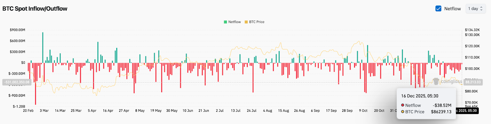 Flow data continues to work against buyers. Recent sessions show persistent spot outflows, with daily netflows remaining negative despite price stabilization attempts. On December 16, Bitcoin recorded roughly $38 million in net outflows, extending a broader pattern that has dominated much of the past month.