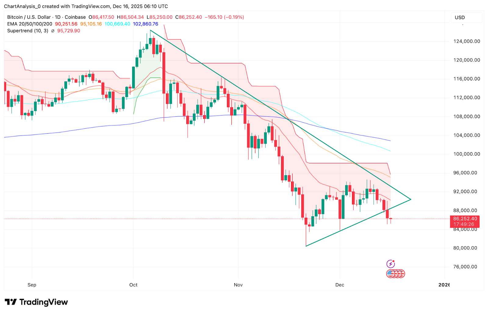On the daily chart, Bitcoin remains locked beneath a well-defined descending trendline that has capped every recovery since the October peak. The structure has evolved into a contracting triangle, with lower highs pressing against a gradually rising support base. This pattern reflects indecision on the surface, but the broader context favors sellers.