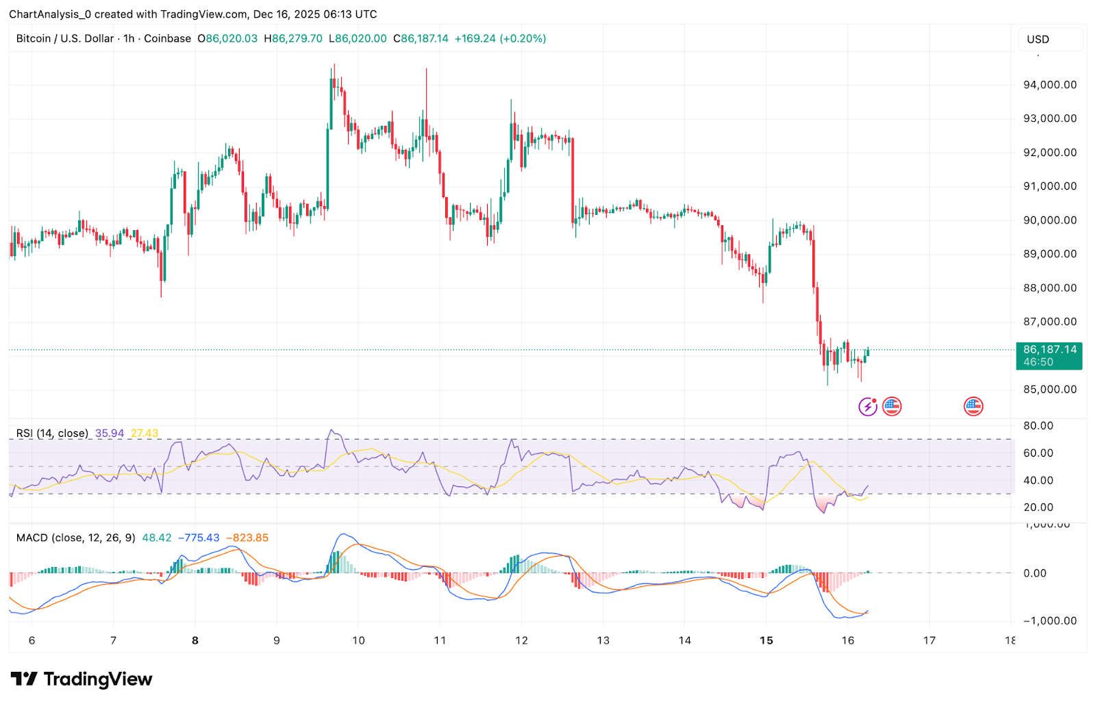 Shorter timeframes show early signs of stabilization, but no confirmation of a reversal. On the 1-hour chart, Bitcoin recently flushed toward the $85,500 area before finding temporary support. Price has since moved sideways, forming a narrow base just above $86,000.