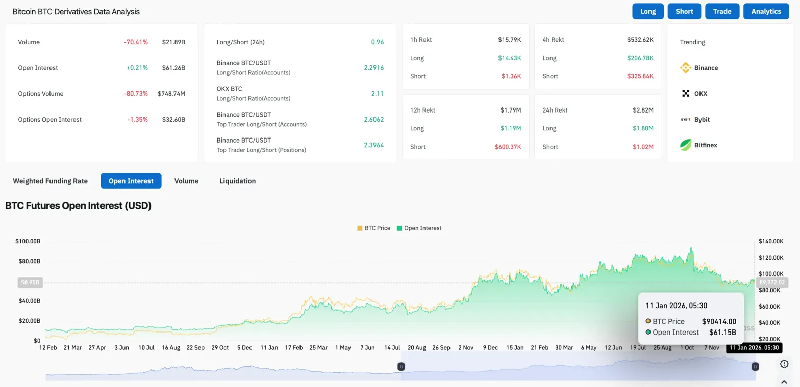 Futures data reveals conflicting signals. Open interest climbed 0.21 percent to $61.26 billion, showing stable positioning with minimal new capital entering the market. However, volume collapsed 70.41 percent to $21.89 billion, marking one of the quietest sessions in months.