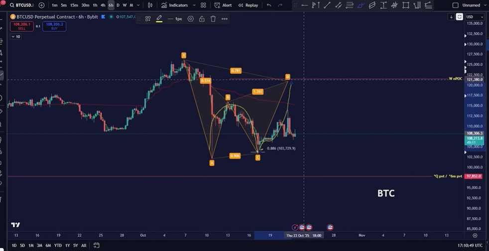 Bitcoin has traded quietly since its October 6 top near $126,000. Analyst DataDash is now watching a Gartley pattern, a harmonic setup that points to a short-term rise toward $120,000.