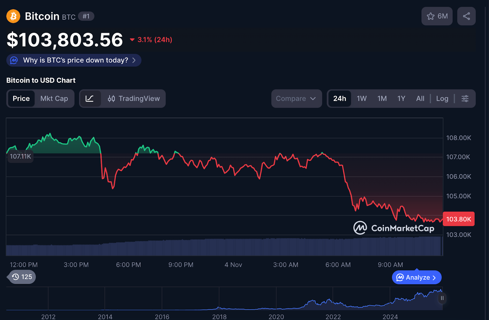 Bitcoin is currently priced at $103,803, marking a 3% decline in the past day, a 9% weekly drop, and a 16% fall over the past month. The pullback has erased most of October’s gains and cooled the excitement that followed the earlier surge above $110,000.