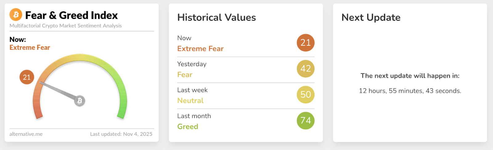 - Crypto Fear & Greed Index plunges to 21, indicating “extreme fear.”