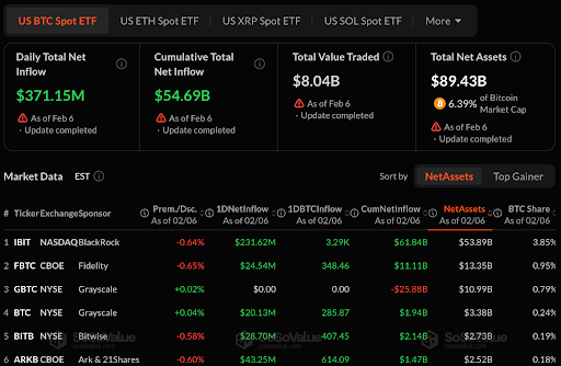 Despite lingering caution, institutional demand has not disappeared. U.S. spot Bitcoin exchange-traded funds recorded $371 million in net inflows on February 6 as investors stepped in following the sharp correction.