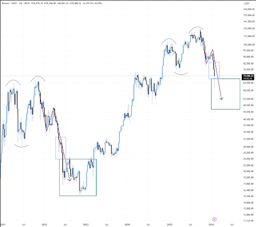 Meanwhile, some analysts believe Bitcoin’s recent price action mirrors the early stages of the 2022 bear market. Analyst BitBull compared current charts to those of that period and argued that full capitulation may not have occurred yet. The analyst calls for a potential “real bottom” below $50,000 if history repeats.