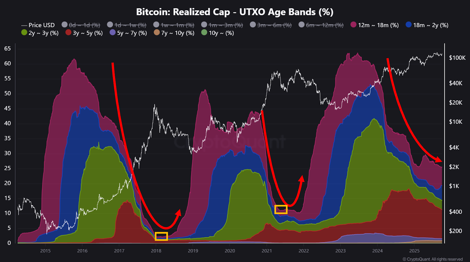 However, he noted that the share of BTC held for more than a year is only gradually declining, suggesting the cycle has not yet peaked.