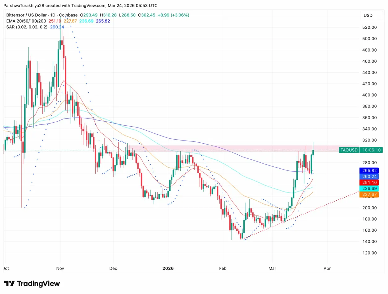Bittensor is back above $300. The daily chart shows all four EMAs cleared, the SAR flipped to support, and price pressing into the $310 to $320 resistance zone that capped the March 20 spike. The chart is building a case, and the people talking about TAO right now are not anonymous Twitter accounts.