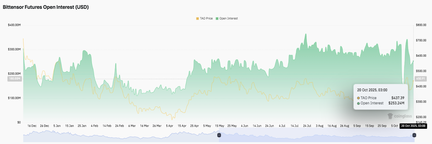 Mid-year corrections led to temporary declines, but October data shows open interest rebounding to $253.24 million while TAO traded near $437. This rebound suggests that traders are positioning for another major price movement, signaling increasing confidence in the asset’s trajectory.