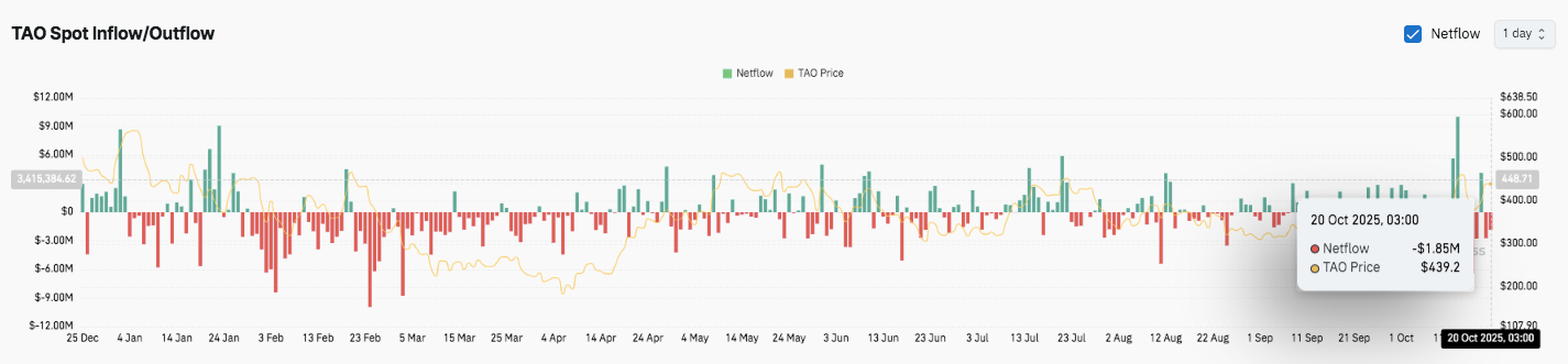 Market data reveals alternating inflows and outflows since early 2025. Heavy red bars between January and March reflected strong sell pressure, with outflows surpassing $9 million. Consequently, TAO’s price dipped during that period. However, inflows reappeared between June and September, providing stability around the $400 level.