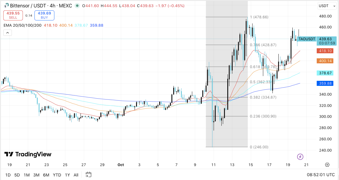 TAO is currently trading at $439.63, consolidating just above the 0.786 Fibonacci level at $428.87. This area has become an immediate support zone following a strong rebound from $362.33, which coincides with the 0.5 Fibonacci level. The price remains comfortably above the 20-day and 50-day exponential moving averages, signaling sustained bullish momentum.