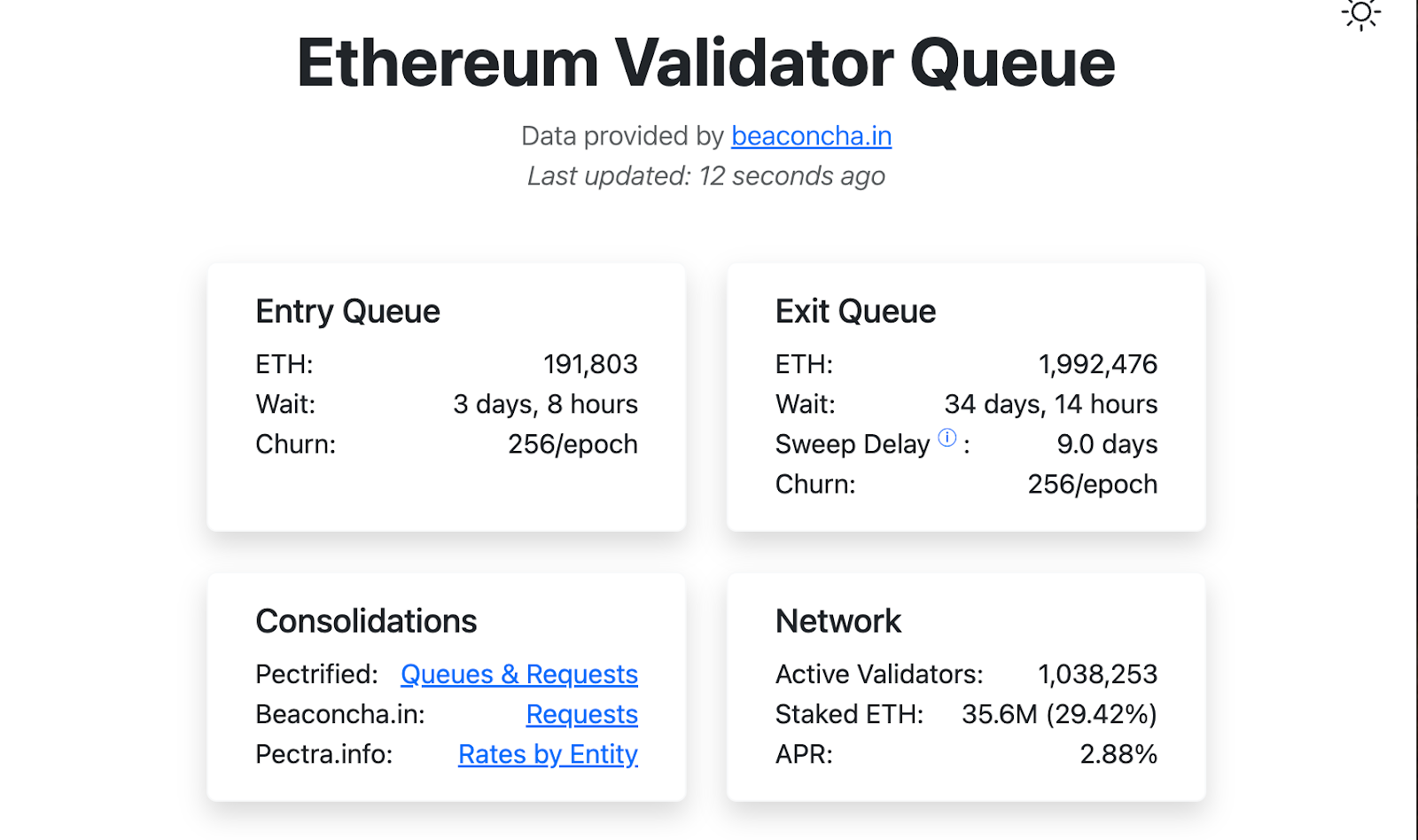On-chain data shows Ethereum’s staking system currently faces an average entry wait of about three days and an exit queue of roughly 34 days, with more than 2 million tokens awaiting withdrawal.