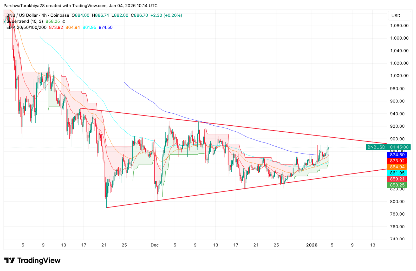 - BNB is compressing between rising support from December lows and a descending trendline near $900–$910.