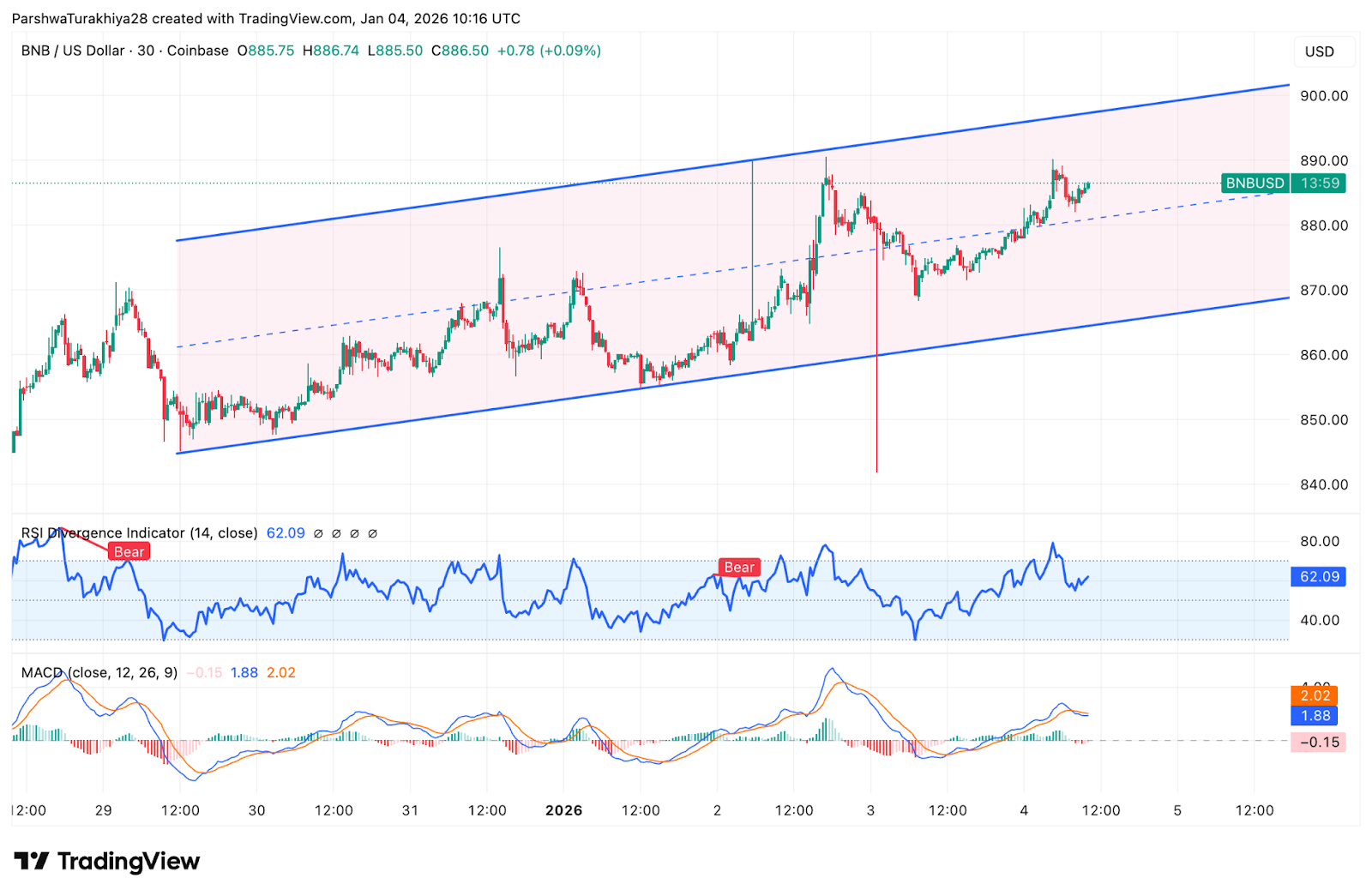 BNB price today trades near $886 as the market heads into January 5 with buyers defending rising support inside a tightening structure. Price has stabilized after the late-December slide, but upside remains capped by a descending trendline that has rejected multiple recovery attempts since November.