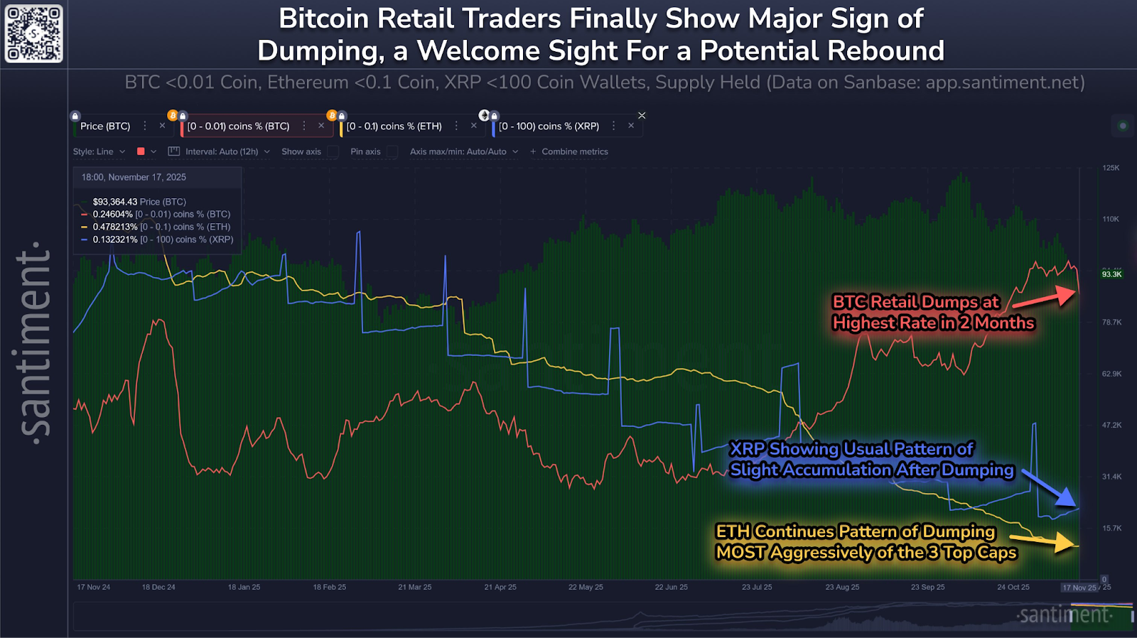 Meanwhile, analytics firm Santiment stated that small‑wallet holders across all three assets have been aggressively dumping. Bitcoin wallets holding less than 0.01 BTC have sold off 0.36% of their supply in the past five days. Ethereum wallets with under 0.1 ETH dumped 0.90% in the past month. And XRP wallets holding under 100 tokens have let go of 1.38% since early November.