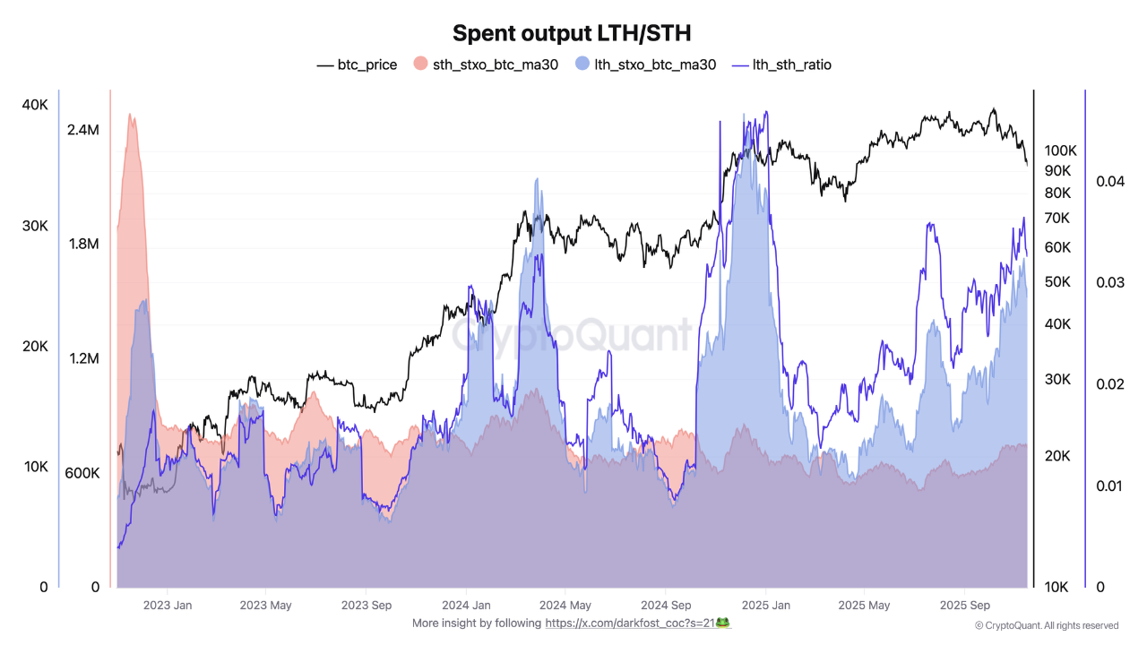 Analyst Darkfost said that long‑term holders own the majority of Bitcoin supply, but they do not generate most of the day‑to‑day selling. Short‑term holders dominate BTC flows, with STXO for STHs sitting near 750,000 on a 30‑day moving average.