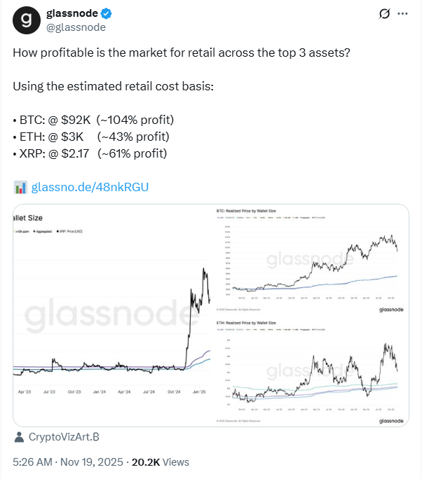 According to its estimated retail cost basis data, Bitcoin retail holders remain up by roughly 104% at a cost basis near $92,000, Ethereum retail wallets hold about 43% profit around $3,000, and XRP retail holders sit on approximately 61% profit at a $2.17 basis.