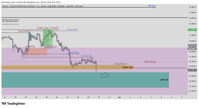 Not everyone was rattled. Analyst Astronomer said he had actually added to his Bitcoin long position during the dip, citing a specific support zone he had been watching called the silver pocket.