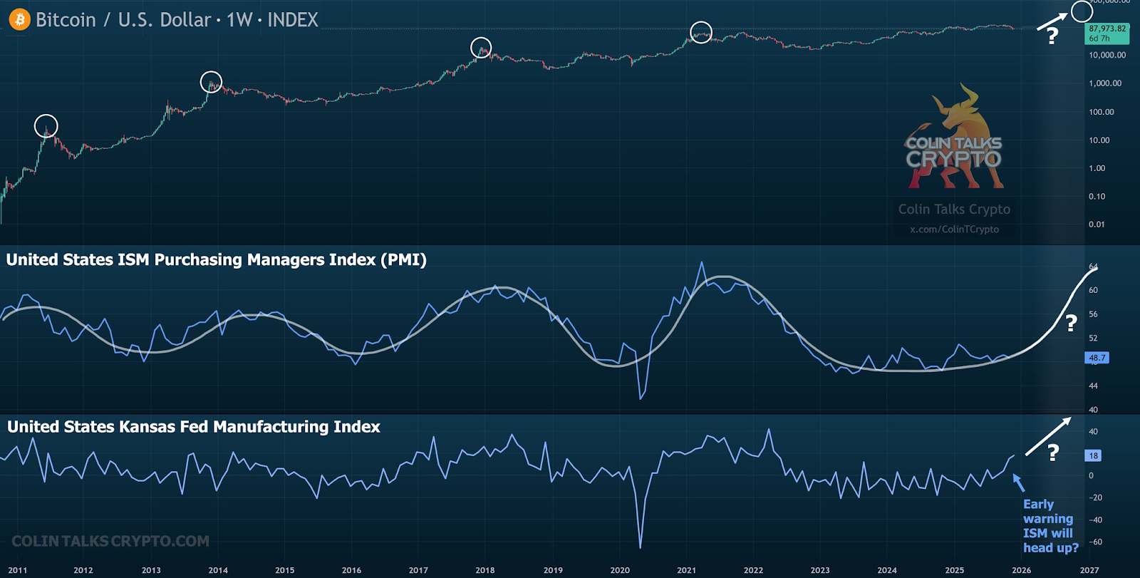 - The Bitcoin price has gradually followed the ISM Manufacturing PMI, signaling a potential peak in 2026.