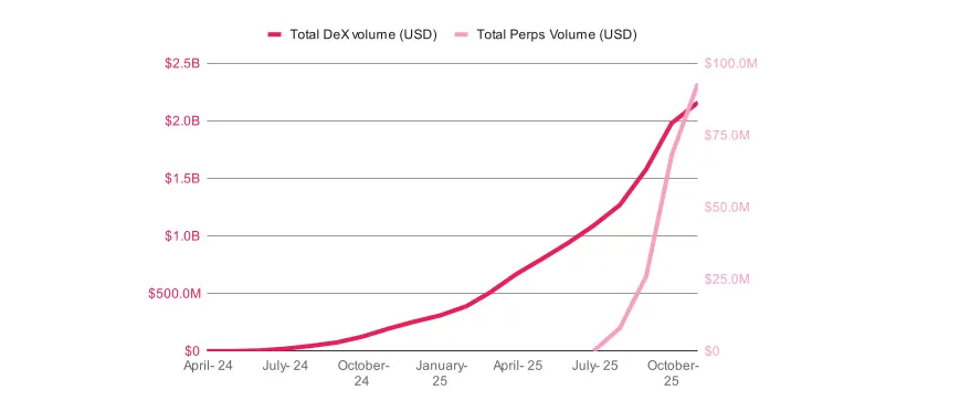 Flare pointed to on-chain data as evidence that the strategy is already in motion. The network has recorded more than $2 billion in cumulative decentralized exchange volume, averaging around $210 million per month, along with over $100 million in cumulative perpetuals trading and roughly $1.5 million in open interest.