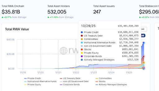The initiative aims to unlock fresh layers of liquidity and capital efficiency across the Mantle ecosystem as asset tokenization continues to gain popularity. RWA.XYZ data shows tokenized assets have hit $35 billion with over 532,005 active holders globally.