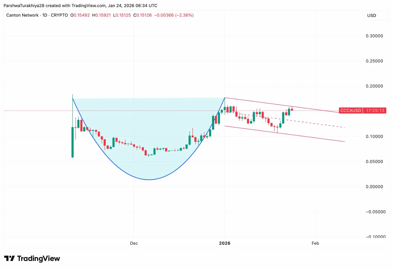 Canton price today trades near $0.15206 as the token consolidates after a strong rally from the January 19 low. The Swyftx listing on January 21 expanded retail access and sparked immediate buying interest, pushing CC above all four EMAs while a bullish pattern nears completion on the daily chart.