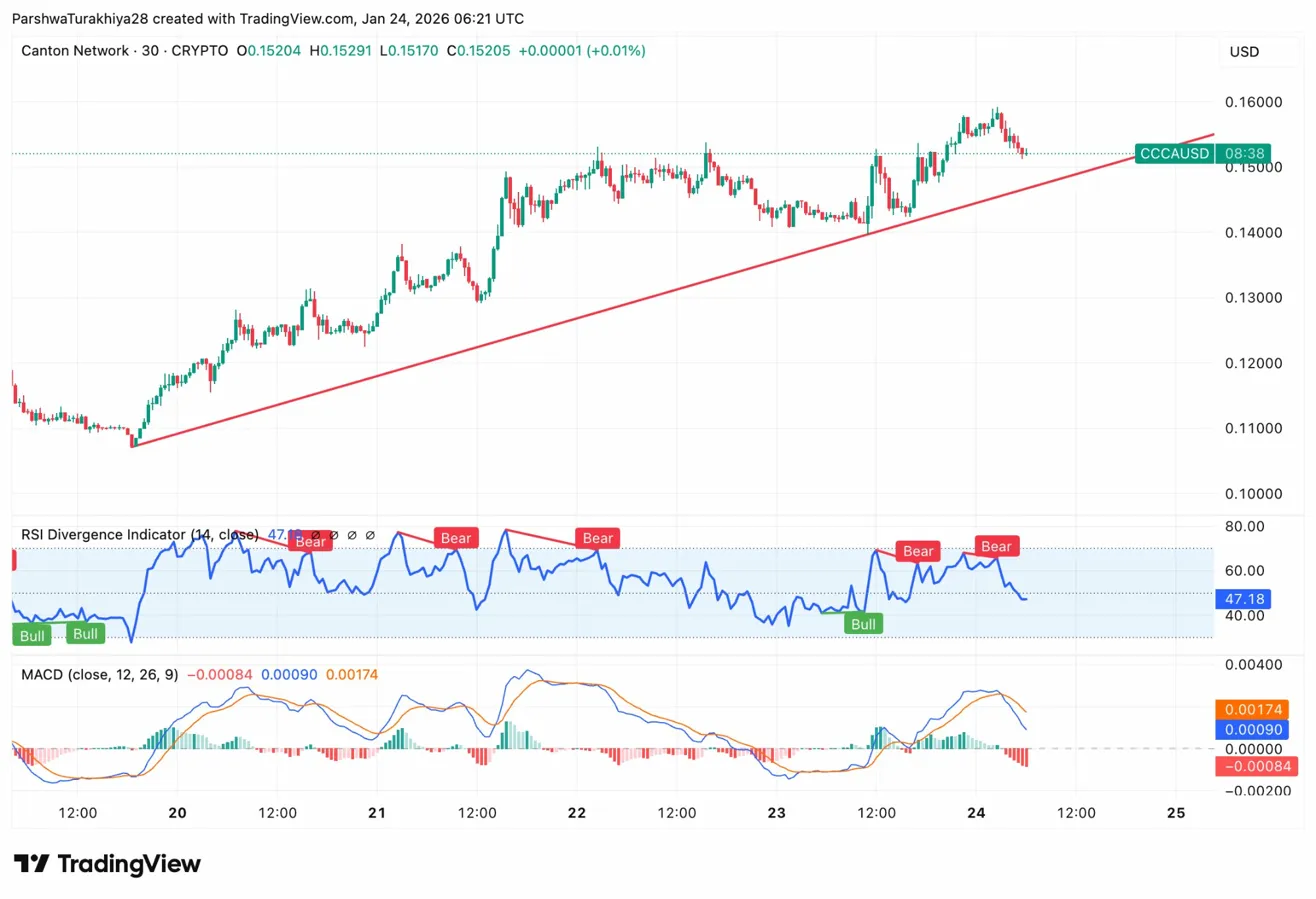 - Canton consolidates at $0.15 after the January 21 Swyftx listing expanded retail access and triggered a sharp rally from the $0.11 low.