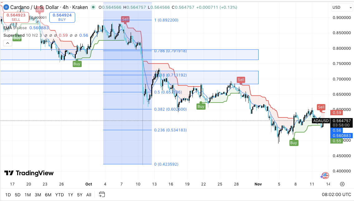 The technical picture shows ADA attempting to carve a higher low around $0.555 while still trading under a broader lower-high sequence. Price remains compressed between the Supertrend resistance and the support band near $0.560, creating conditions that often precede a directional expansion. A decisive breakout from this structure could trigger a sharp move in either direction.