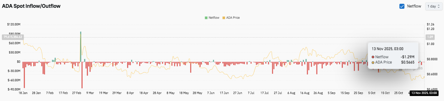 Spot flows continue to reflect selling pressure. Outflows dominated from September to November. Recent readings show a decline of roughly $1.29 million as ADA traded near $0.5665.