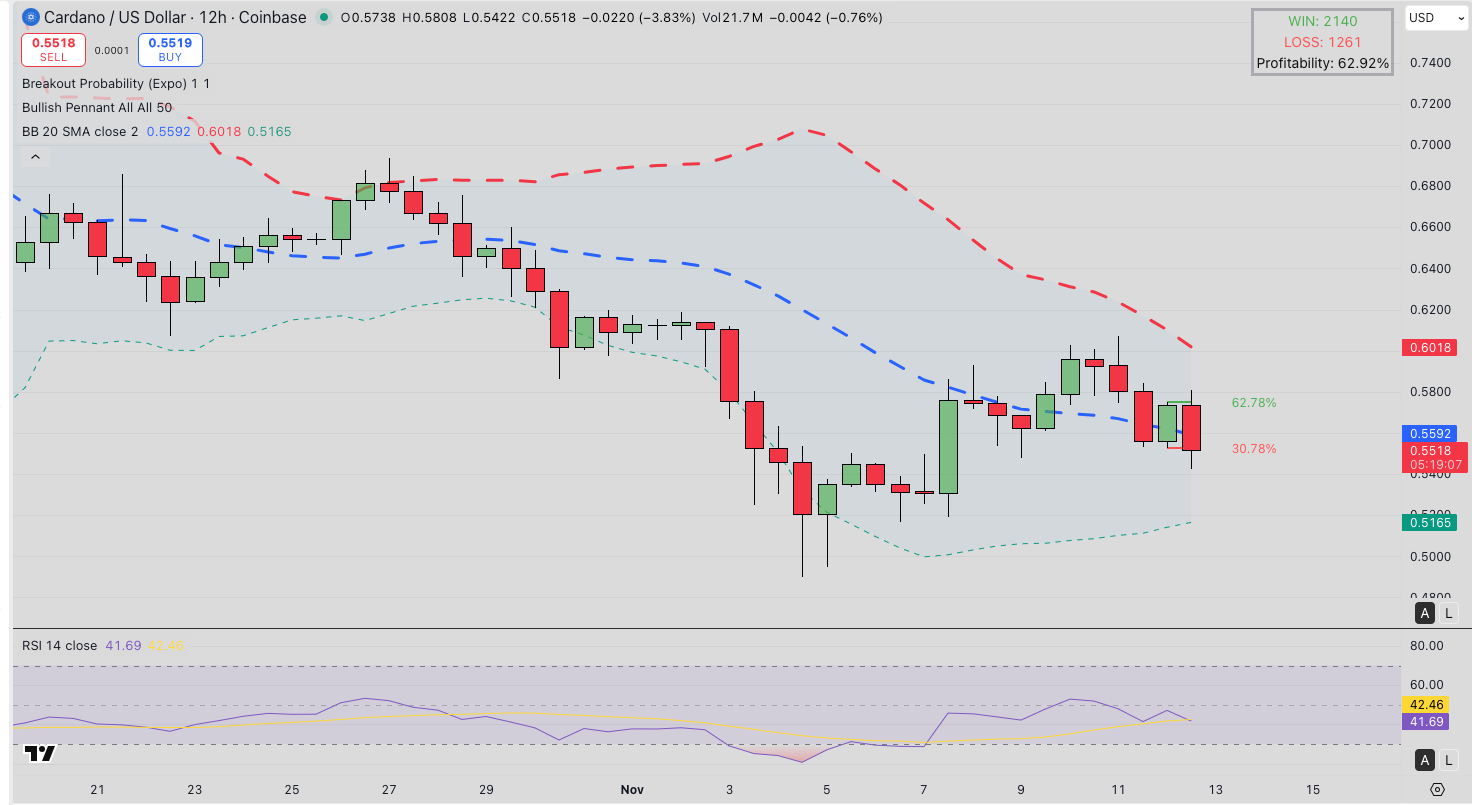 The 12-hour chart shows ADA sliding below its mid-Bollinger band (20-SMA) at $0.5592, signaling fading bullish momentum. The lower band sits near $0.5165, a zone that has historically acted as a stable liquidity pocket for reversals. A decisive close below $0.55 could invite a retest of this level, while sustained pressure might expose $0.50 as the next support target.