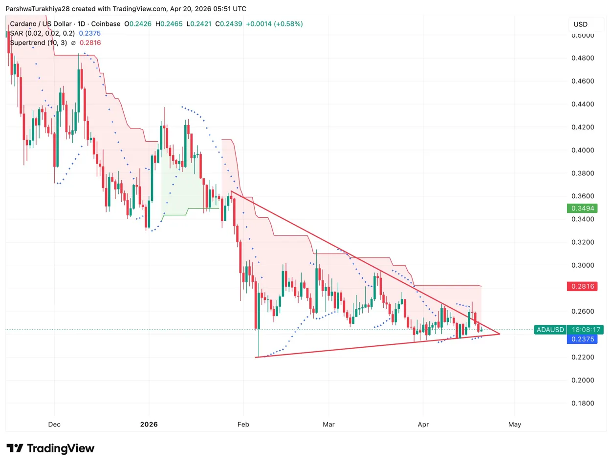 Price bounced off $0.2421 intraday and closed at $0.2439, holding the SAR at $0.2375 as the critical floor. The wedge has been compressing for two months and both lines meet this week. A daily close above the wedge upper boundary near $0.2550 puts the Supertrend at $0.2816 in play, then the $0.3494 level above. Losing the SAR at $0.2375 on a daily close breaks the wedge floor and opens $0.2200, the February low, with nothing in between.