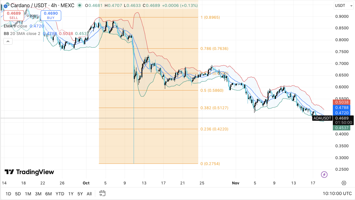 ADA trades near $0.4689 after rejecting several recovery attempts on the mid-range oscillators. The 20-SMA stays above the market and acts as firm dynamic resistance. Moreover, lower highs continue to form across the 4-hour chart, confirming persistent selling pressure.
