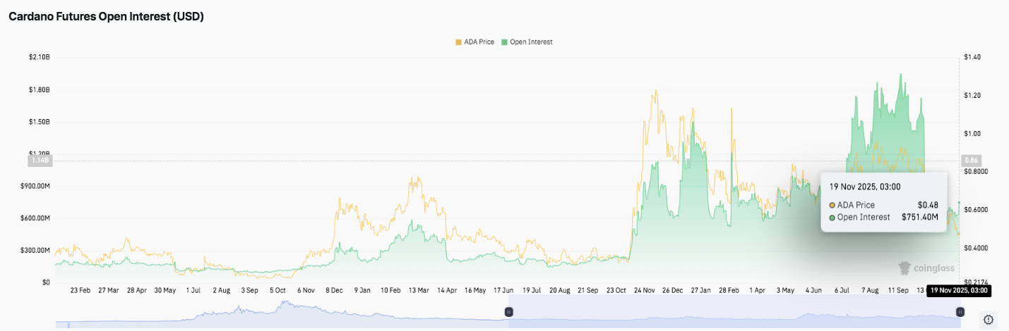 Cardano futures open interest shows strong activity through the year. Traders continue to deploy leverage even as the spot chart trends lower.
