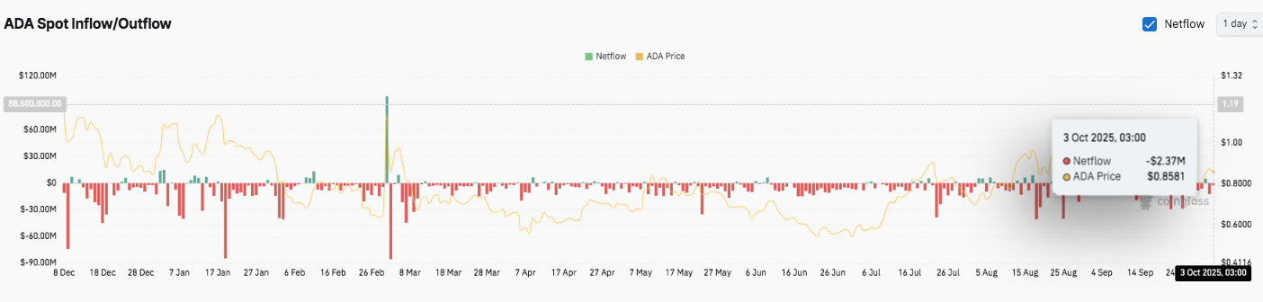 Spot inflows and outflows provide further insight. Recent months show persistent net outflows, indicating that investors are moving ADA off exchanges. On October 3, ADA recorded a net outflow of $2.37 million.