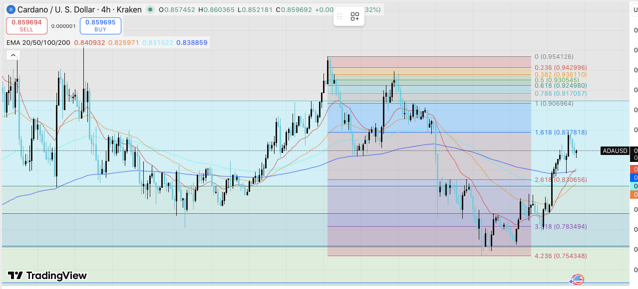 Buyers recently pushed ADA toward the 1.618 Fibonacci extension at $0.878, where it faced resistance and pulled back slightly. This rebound reflects growing optimism among traders and investors who closely monitor key technical levels.