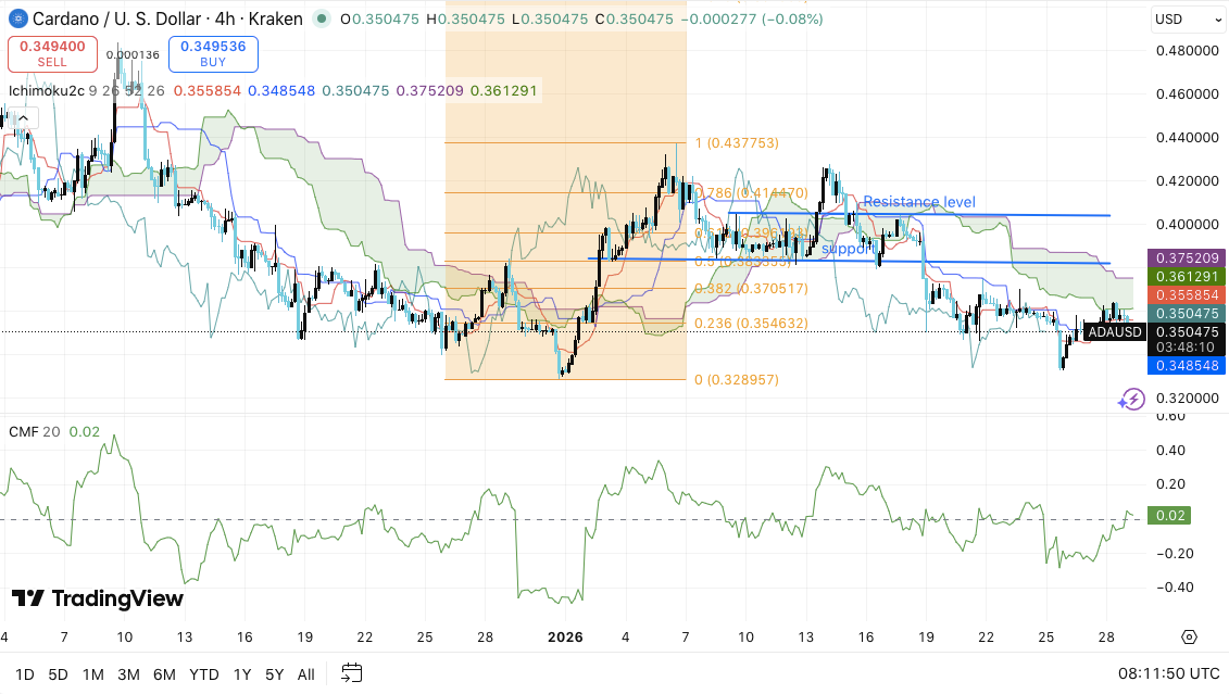 On the 4-hour timeframe, Cardano remains locked in a bearish structure defined by lower highs and limited rebound strength. Price holds below the Ichimoku cloud and the Kijun-sen, reinforcing downside bias.