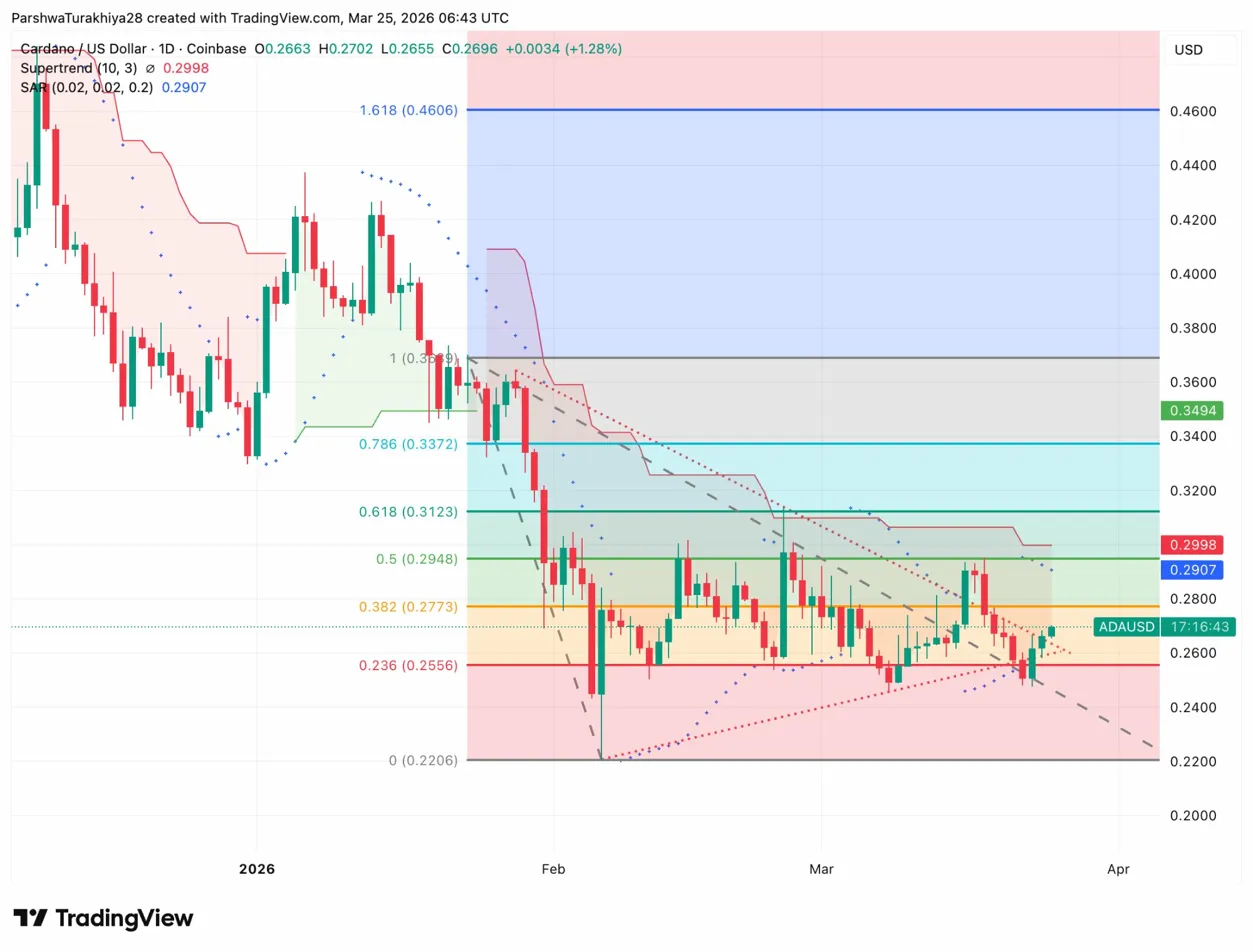 After collapsing from $0.3372 in early February, ADA wicked down to $0.2206 in late February before stabilizing. Price has been consolidating between the 0.236 Fibonacci level at $0.2556 and the 0.382 level at $0.2773 ever since, unable to reclaim either cleanly on a daily close.