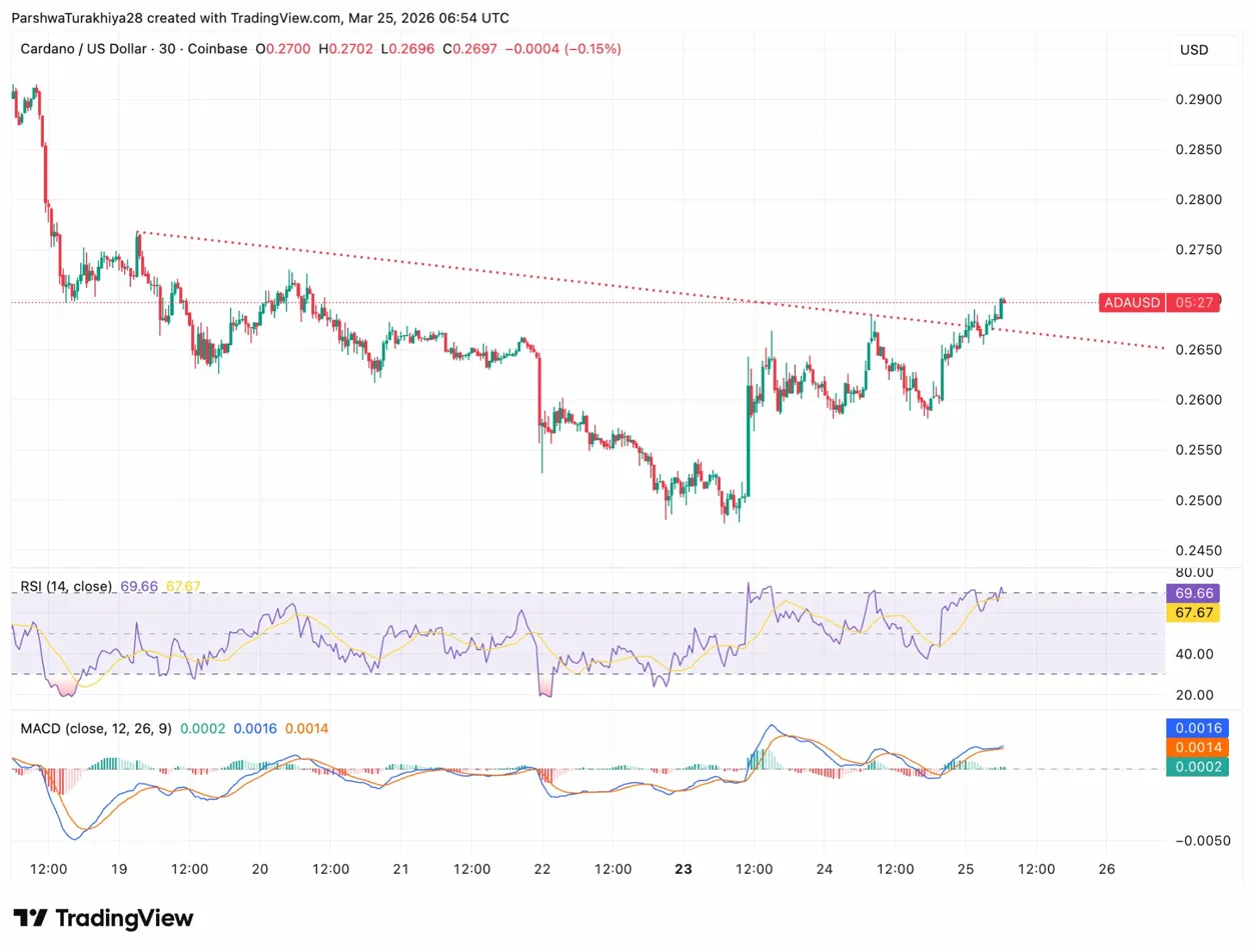 ADA flushed to $0.2490 on March 22, the lowest print in weeks, then recovered sharply back above $0.2670. Price is now pressing into the descending trendline from the March 18 high near $0.2700 to $0.2710.