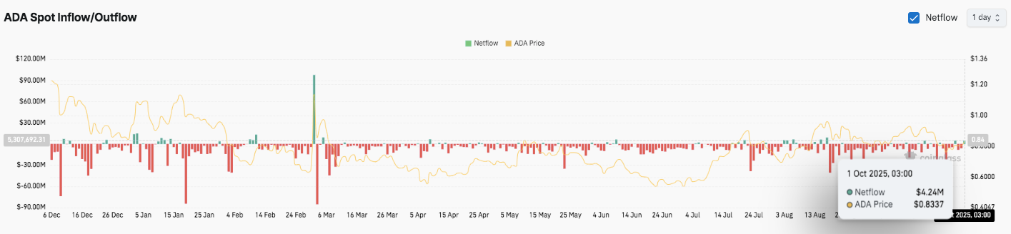 However, October 1 recorded a notable $4.24 million inflow, which may reflect profit-taking or preparation for near-term volatility. If inflows rise alongside resistance retests, ADA could face short-term selling pressure even as its broader trend remains constructive.