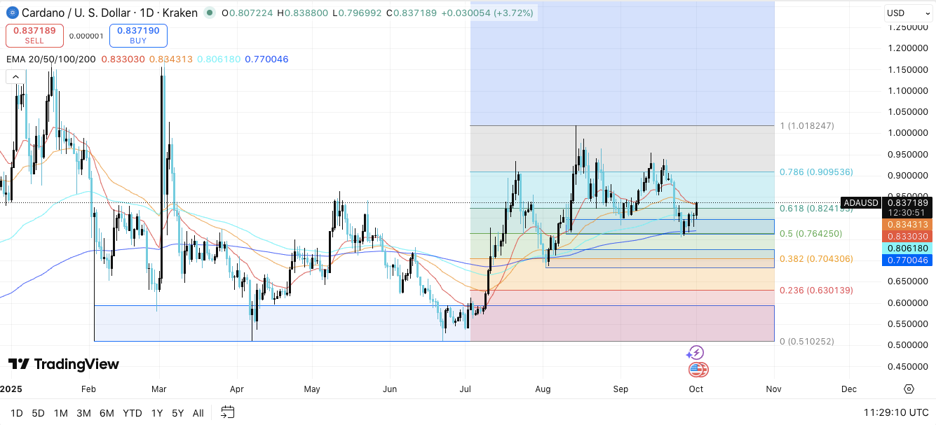 The near-term outlook for ADA depends on buyers defending the $0.824 zone and overcoming clustered EMAs at $0.83–$0.84. Holding above this area would strengthen momentum toward $0.91 and eventually $1.01.