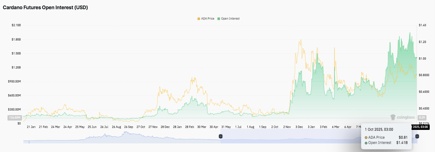 Beyond chart levels, derivatives activity provides valuable insight. Cardano’s futures open interest surged from under $300 million earlier this year to $1.41 billion by October. This steady climb reflects heightened participation and fresh long positions rather than short liquidations.